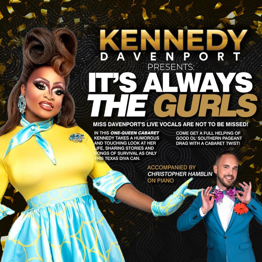 🗓️ Monday, March 3, 9:30 PM 📍 Act2PV (Casa Karma Red Room) Kennedy Davenport, of RuPaul’s Drag Race fame and Pageant ROYALTY, presents “It’s Always the Gurls!” In this One-Queen Cabaret, Kennedy takes a humorous and touching look at her life, sharing stories and songs of survival as only this Texas Diva can. Accompanied by Christopher Hamblin on the piano, Miss Davenport’s live vocals are not to be missed.