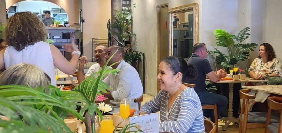 The extensive four-page menu consists of a clipboard with listings for Coffee & Juices, Mimosas & Drinks, Sweet & Savory items, and Eggs & Sandwiches. Everything is a la carte and looks wonderful coming out of the kitchen. There is a good blend of Mexican favorites like beef birria chilaquiles and smoked marlin burritos with traditional brunch favorites but with some spicy twists. For example, the eggs bennie offers chipotle-spiced Hollandaise sauce and lemon-peppered fries to accompany the ZUMO burger.