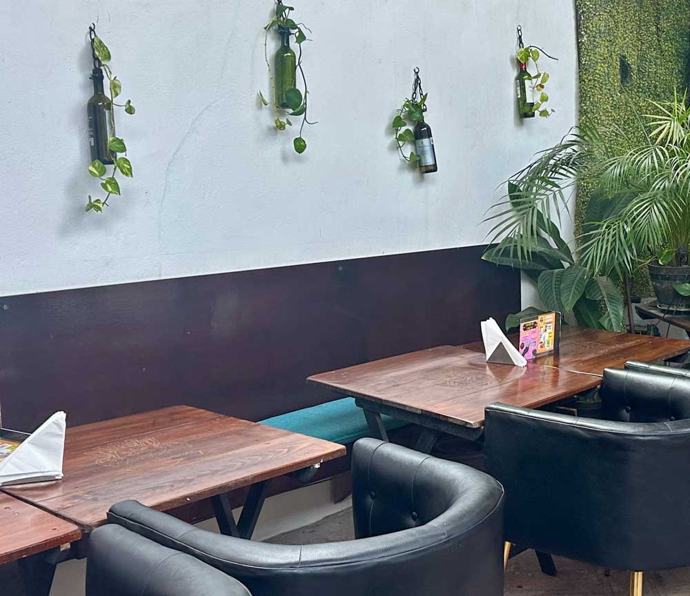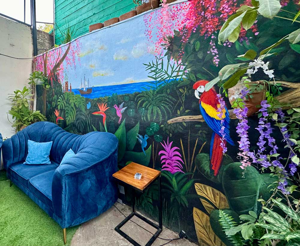 From the moment you arrive, El Rey reveals its thoughtful layout and relaxed yet stylish charm. The venue features three distinct spaces, each designed to invite you in and make you feel at home. The front patio—shaded and breezy—is ideal for people-watching or enjoying an afternoon cocktail. Step inside and you’re welcomed into the main lounge: a lively indoor area with cozy seating, a stunning bar, and vibrant, eclectic décor that captures the fun, laid-back spirit of the city. Wander further and you’ll discover the garden, a hidden gem tucked behind the building. This tranquil, tropical space is adorned with a colorful mural, oversized lounge sofas, and plenty of dining tables for a quiet meal under the stars.