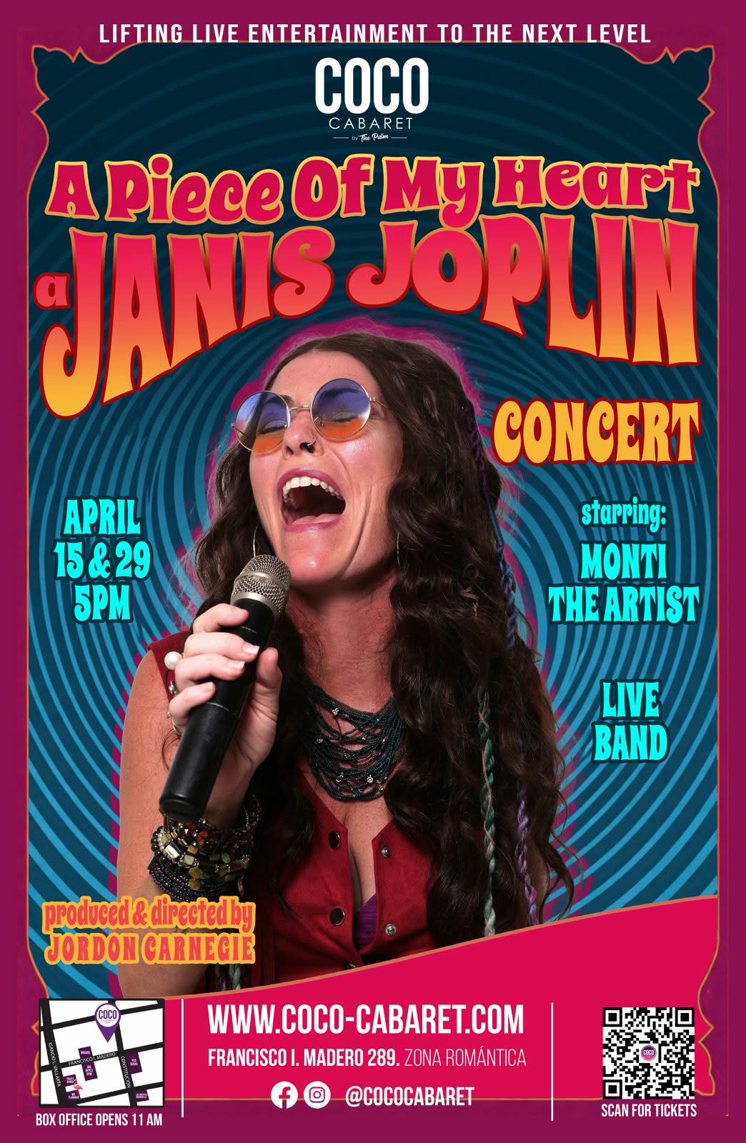 “A Piece of My Heart” is a high-energy, immersive tribute concert that brings Janis’s most iconic performances back to life. Starring internationally recognized Monti The Artist, this show aims to transport audiences to the late 1960s, featuring Janis’s most unforgettable songs intertwined with stories of both Joplin’s and Monti’s life experiences.