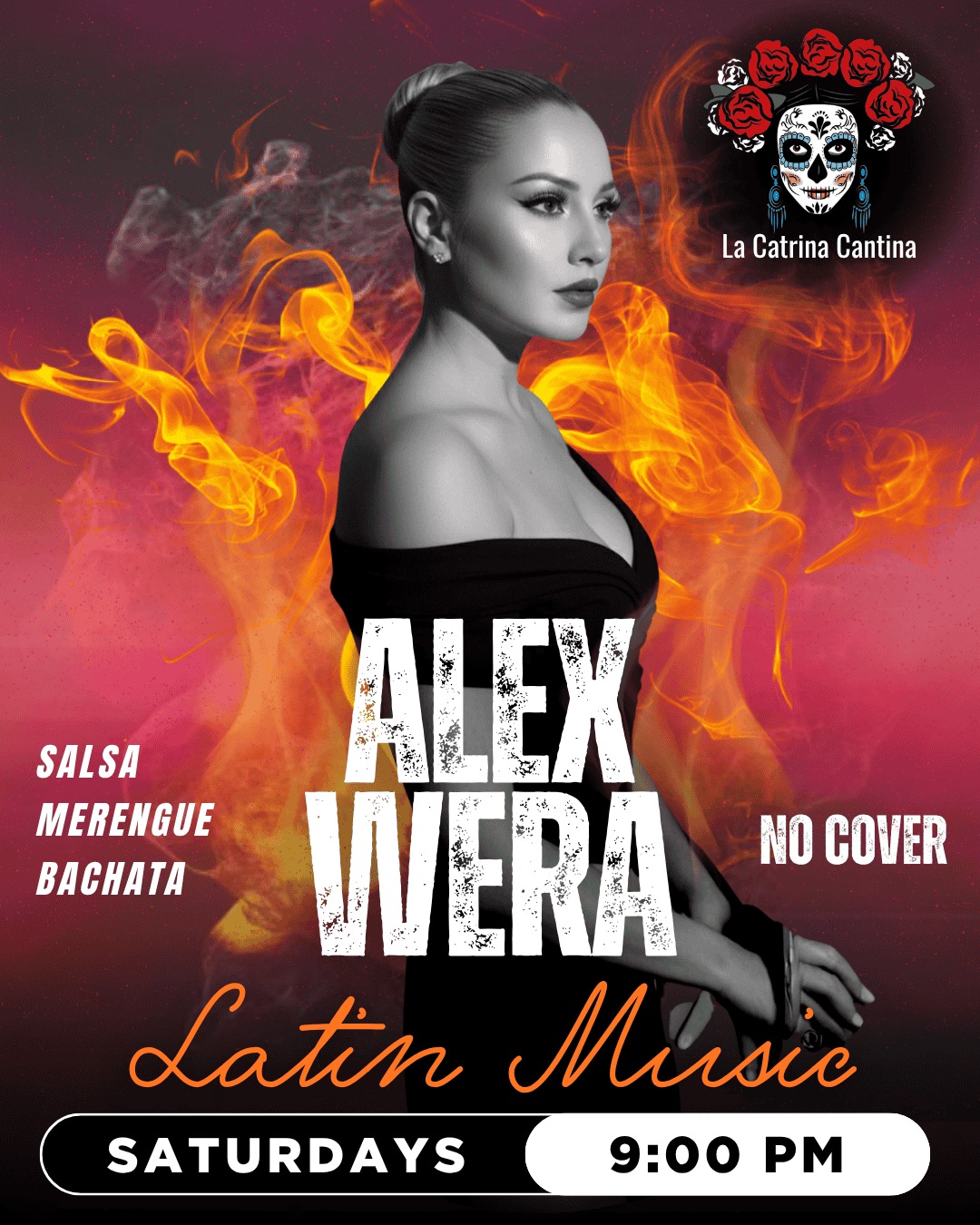 Get ready to dance with Alex Wera at La Catrina Cantina! Alex will get you moving to the rhythms of salsa, bachata, and cumbia, bringing the best music to lift your spirits and make your night unforgettable. No cover!