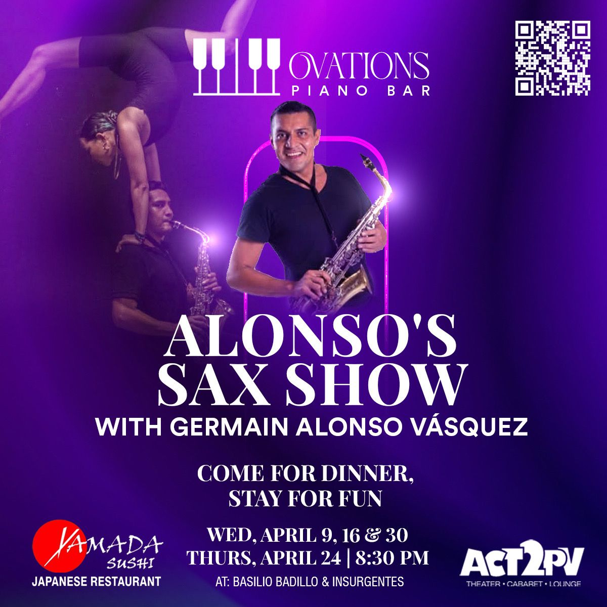 Experience an unforgettable night at Ovations Piano Bar with Alonso, a world-class saxophonist, dancer, and award-winning choreographer. Known for his work in Rhythms of the Night and Alma Show under Cirque du Soleil directors, Alonso now brings a mesmerizing saxophone performance filled with magic, light, and color—accompanied by two incredible dancers and acrobats. This one-of-a-kind show blends music, movement, and visual wonder into a spellbinding evening you won’t want to miss.