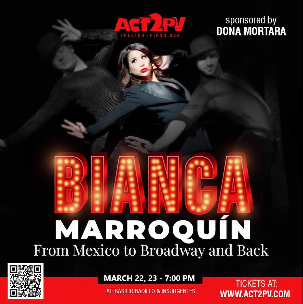 YES! It’s true! One of Mexico’s greatest stars, Bianca Marroquín, is coming to Act2PV!! Bianca Marroquín is a trailblazing Broadway actress and recording artist whose career has bridged the vibrant worlds of both American and Mexican theater. Born in Monterrey, Mexico, Bianca became the first Mexican actress to star on Broadway, captivating audiences in her iconic role as Roxie Hart in the revival of Chicago. Her remarkable journey has taken her from Mexico City’s renowned stages, where she starred in beloved productions such as Disney’s Beauty and the Beast, Rent, Phantom of the Opera, The Vagina Monologues, and Chicago, to Broadway’s Chicago (and more), where she has left an indelible mark, as well. In addition to her acting prowess, Bianca’s artistry extends to the music world with her solo album, El Mundo Era Mio, which blends contemporary pop and Latin influences, featuring songs she co-wrote and performed alongside live studio musicians.
