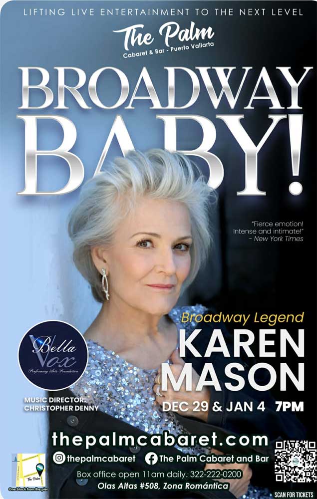 After her SOLD-OUT SHOWS last year, Broadway legend Karen Mason brings a celebration of her favorite music to her favorite Mexican home, Puerto Vallarta! Don’t miss this unforgettable night of music, stories, laughter, and joy, and always a surprise or two! Featuring fan favorites like ALL THAT JAZZ, NEW YORK/NEW YORK; SOMETHING’S COMING, YOU’VE GOT A FRIEND, KAREN’S BACK IN TOWN, FOR GOOD, and many more! You will be shouting OTRA, for sure! (Directed by Barry Kleinbort, with Music Direction by Christopher Denny)
