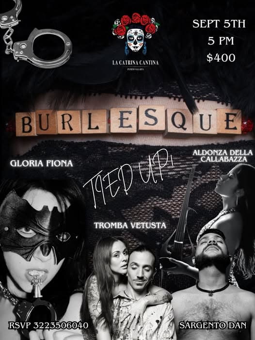 Slip into your most daring Burlesque or Bondage-inspired attire and join us for Burlesque Night at La Catrina Cantina. This isn’t just a show—it’s an invitation to step into a world of fantasy, to feel without filters, and to celebrate pleasure, play, and beauty in all its forms, no matter your age, body, or story. Hosted by the captivating Gloria Fiona, the evening features sultry burlesque acts, evocative bondage shadow play, and thrilling surprise appearances. Special performances by Tromba Vetusta, Sargento Dan, and Aldonza Della Callabazza promise a night of unforgettable artistry in the heart of Puerto Vallarta.