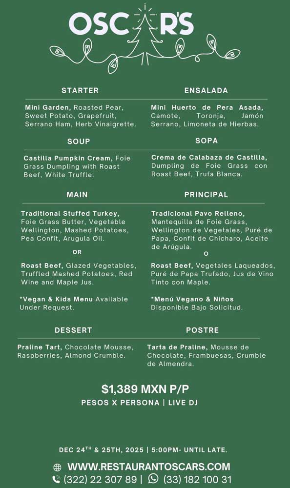 🎁 🎄 Celebrate the holidays at Oscar’s with a festive 4-course menu, live DJ, and exquisite starters, mains, and desserts. Dinner is $1,389 MXN and begins at 5 PM.