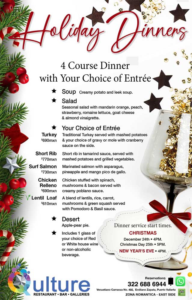 🎁 🎄 Qulture offers a 4-course meal with entrees including turkey, short rib, salmon, chicken relleno, and lentil loaf, priced from 610 MXN. Includes a glass of wine.