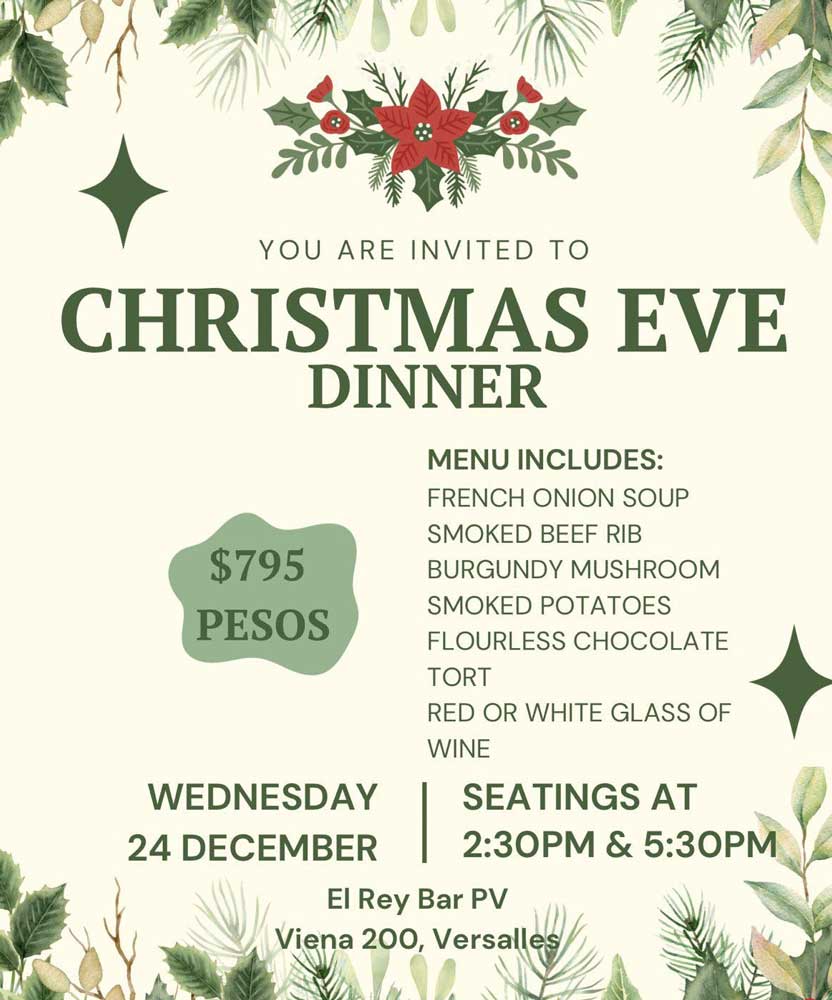 🎁 El Rey Bar & Grill PV has a $795 dinner with French onion soup, smoked beef rib, mushrooms, potatoes, chocolate tort, wine; 2:30 or 5:30 seatings.