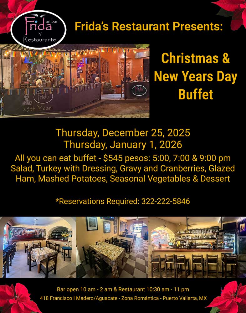 🎄 Bar Frida y Restaurante offers a $545 all-you-can-eat buffet at 5, 7, 9 pm that includes salad, turkey with dressing, ham, sides, dessert. Reservations required.