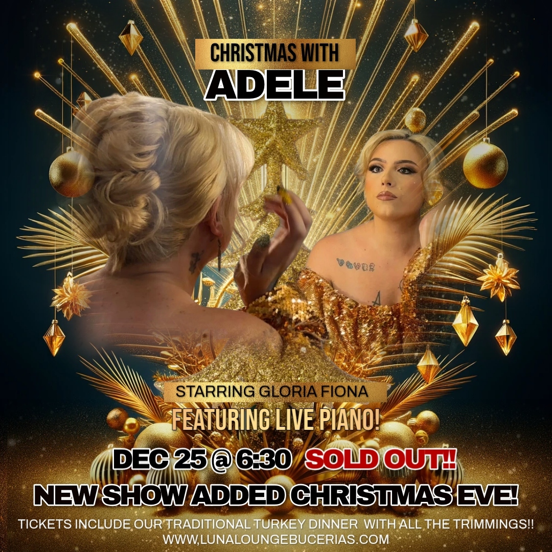 Gloria Fiona first performed her Adele Tribute at Luna Lounge last December. In January 2025, she brought it to the Teatro Vallarta with a full orchestra. She took our breaths away in March when she brought back her pianist and a four-string quartet. From the very first note of that last show, we knew it was the exact magic we wanted to accompany our traditional Christmas dinner at Luna Lounge on December 25th, 2025!! Just added, Christmas Eve December 24!