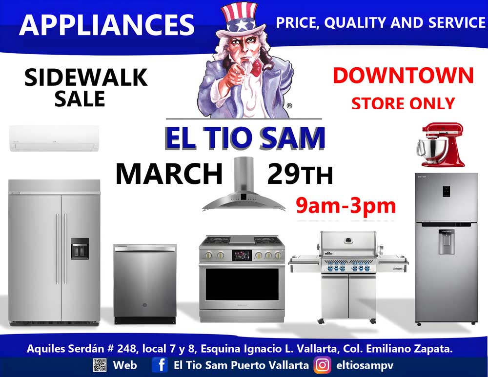 Our annual sidewalk sale offers 10 to 90% off, storewide including Tio Sam appliances, furniture and accessories. Our one day event is a Vallarta tradition!