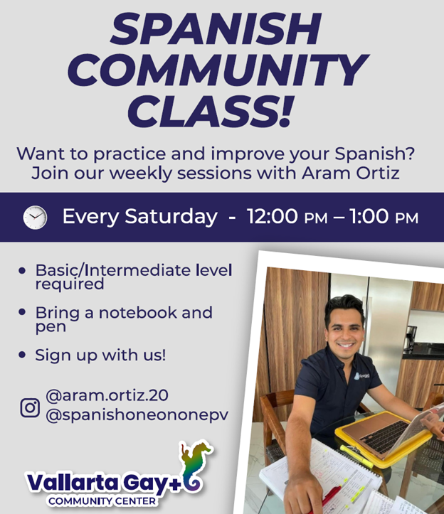 Join our Intermediate Spanish Conversation Class every Saturday, 12:00–1:00 PM at the Vallarta Gay+ Community Center.