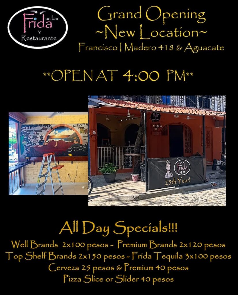 The Grand Opening of Frida Un Bar at our new location at 418 Francisco Madero is Friday, August 1st. Our Grand Opening entertainment will feature Jordon Carnegie, Freddy Otello Pacheco, Tonny Tk, Sargento Dan and Patriz starting at 9 PM. Come join us in the celebration!