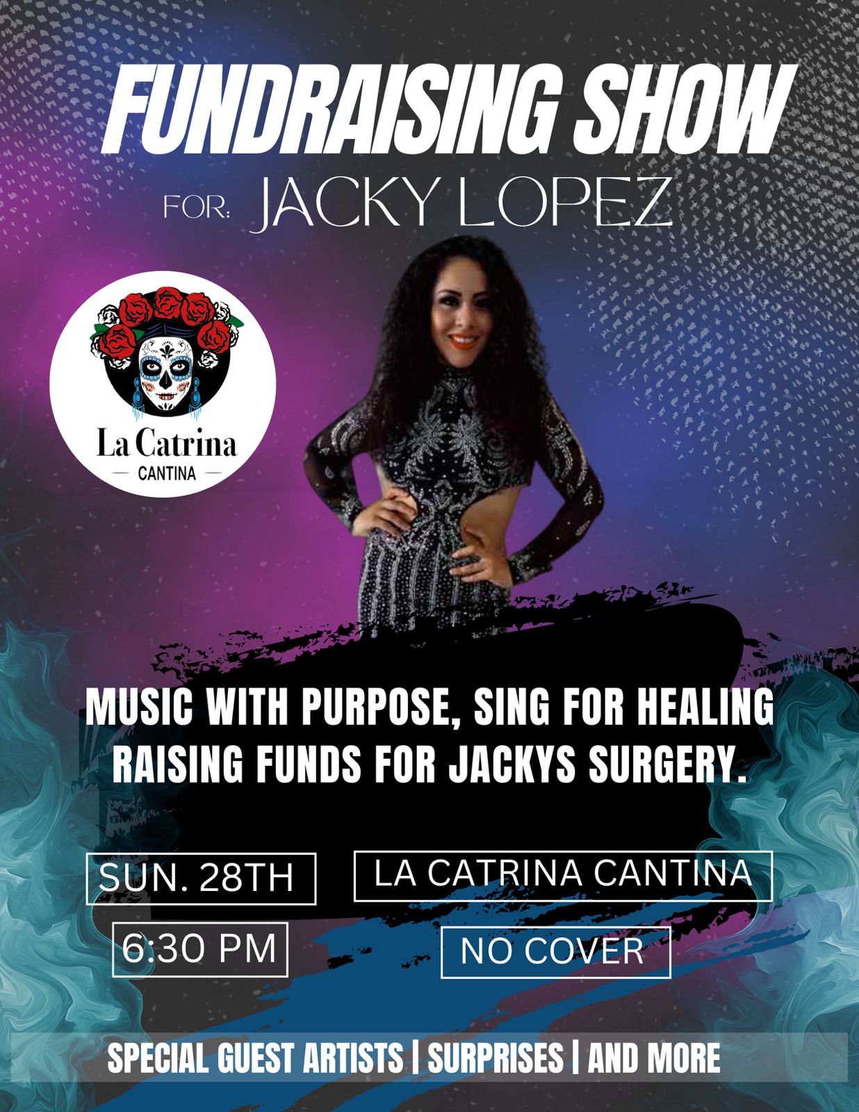 Join us on Sunday, September 28 at 6:30 PM at La Catrina Cantina for a heartfelt evening of music and community. This special benefit show will help raise funds for the surgery and recovery expenses of beloved local singer Jacky Lopez.