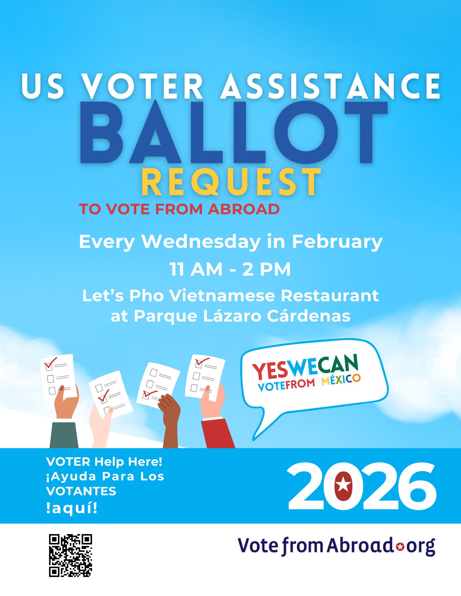 We are offering voter assistance Wednesdays in February from 11:00 a.m. to 2:00 p.m. @ Let’s Pho PV Vietnamese Kitchen (Lázaro Cárdenas 179, Zona Romántica, Emiliano Zapata, Puerto Vallarta, Jalisco 48380).