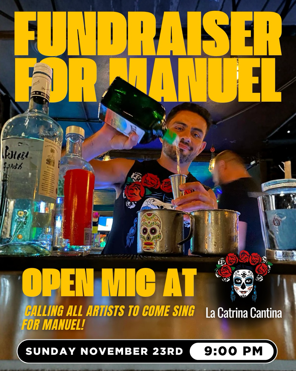 While La Catrina provides IMSS insurance and will continue to pay his salary, the majority of Manuel’s income comes from the tips he earns from his customers. To help support him during this difficult time, we are hosting a fundraiser this Sunday at 9:00 pm during our Open Mic Night.