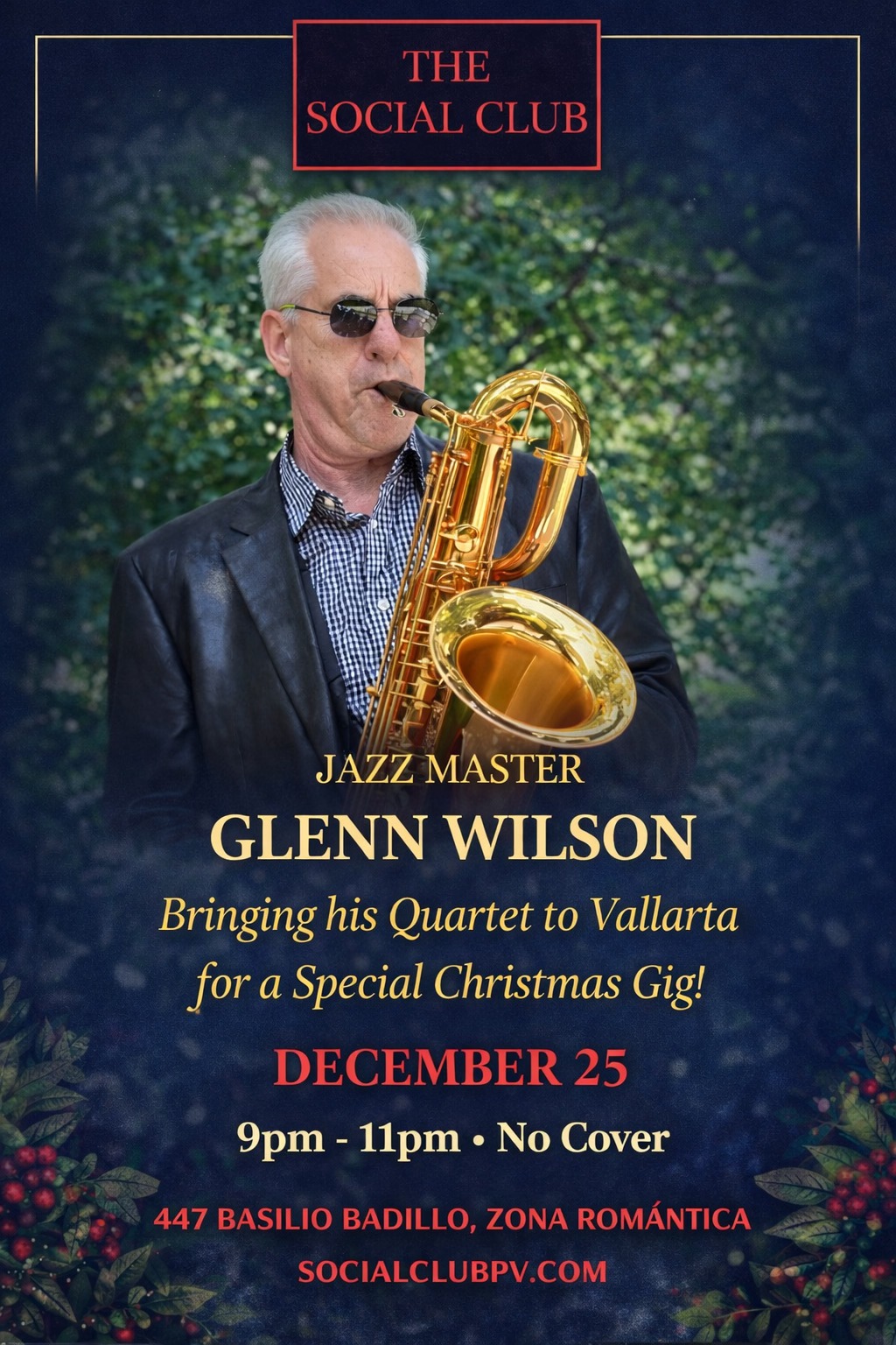 Celebrate the holiday season with an unforgettable evening of live jazz as Jazz Master Glenn Wilson brings his acclaimed quartet to Vallarta for a special one-night performance on December 25, from 9:00 to 11:00 PM.