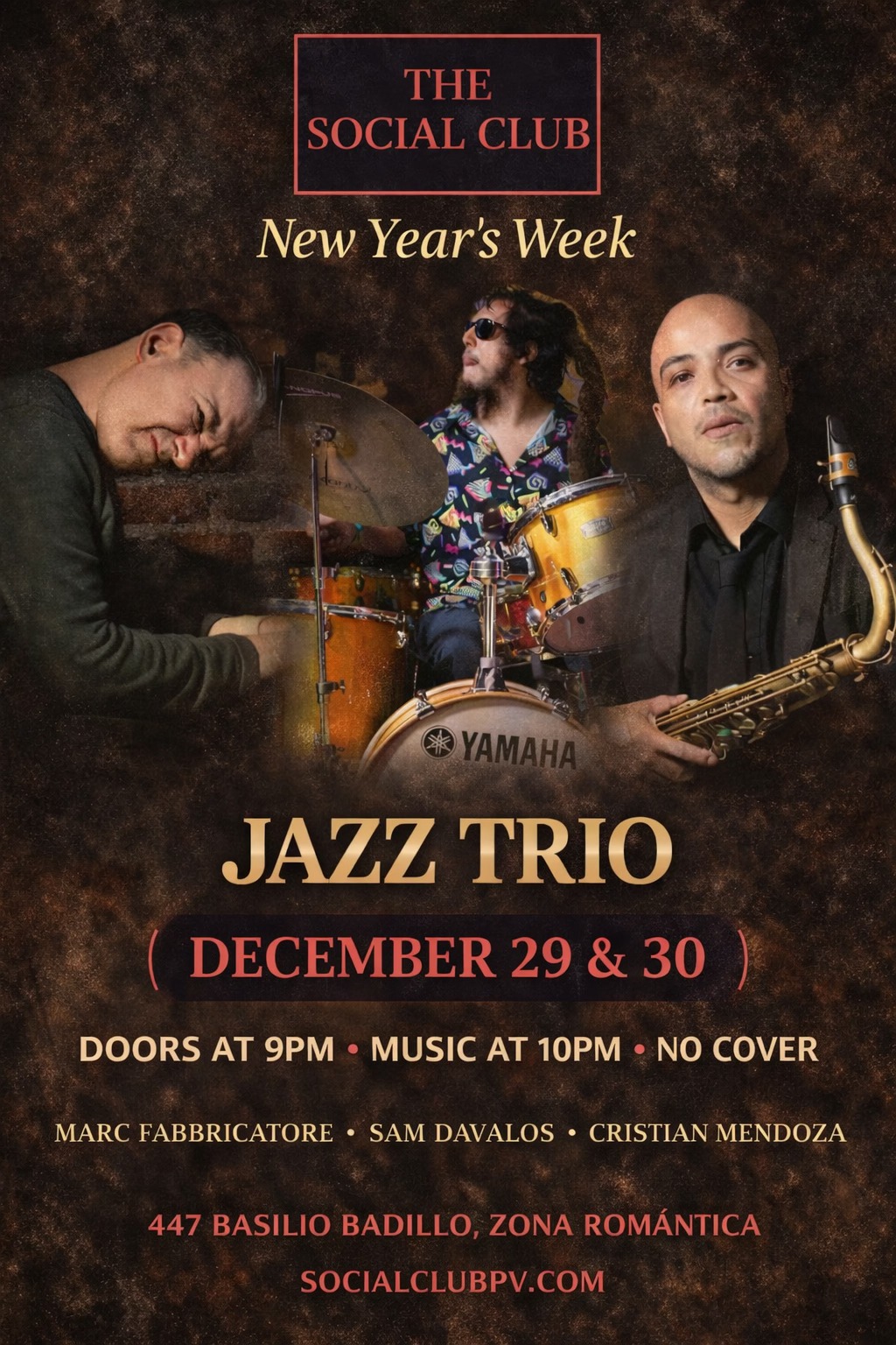 Close out the year with two nights of exceptional live jazz on December 29 and 30 at The Social Club, featuring a dynamic trio led by Marc Fabbricatore, Sam Davalos, and Cristian Mendoza. Doors open at 9:00 PM, with music starting at 10:00 PM, and no cover, making it the perfect late-night destination for jazz lovers and night owls alike.