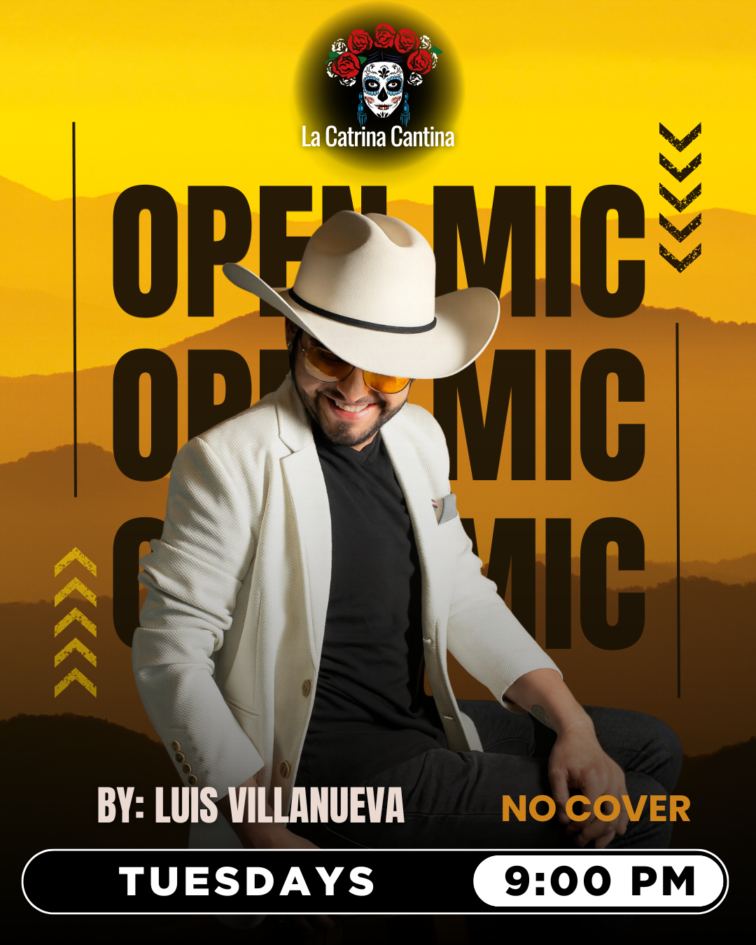 End your Tuesday with Luis Villanueva, a country show featuring Open Mic, where music and talent take the stage together.