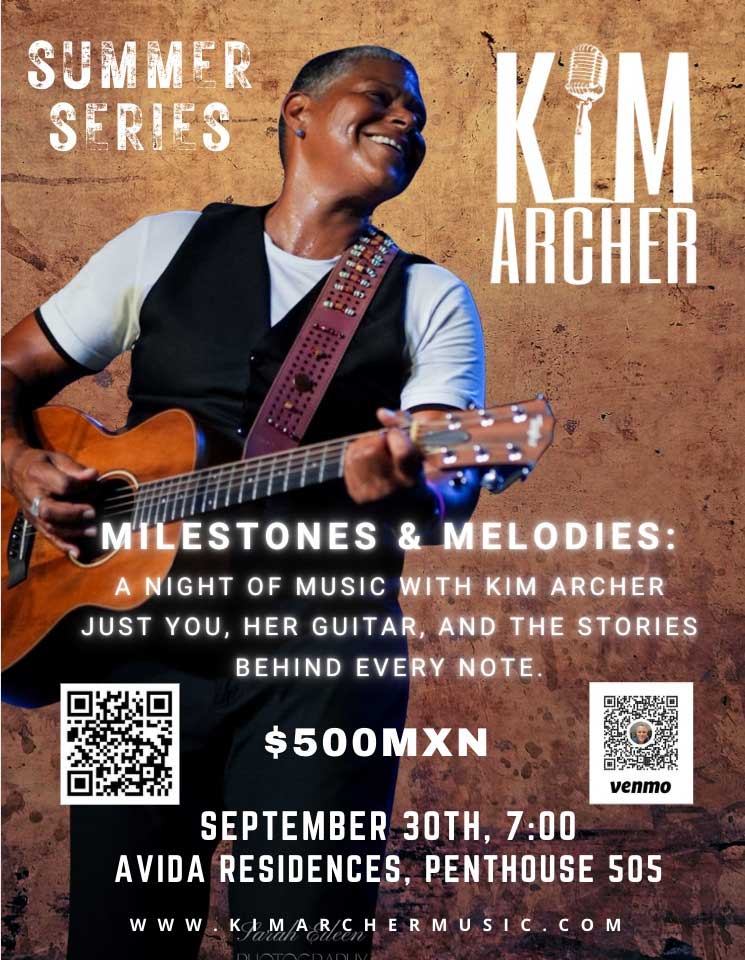 Join us for an intimate evening of music as Kim Archer returns to Puerto Vallarta! After a successful summer of high-energy festival shows with her award-winning soul & funk band, Kim brings a fresh and engaging solo set, featuring emotional and uplifting songs that will invite you to reflect on the beautiful milestones in your life.