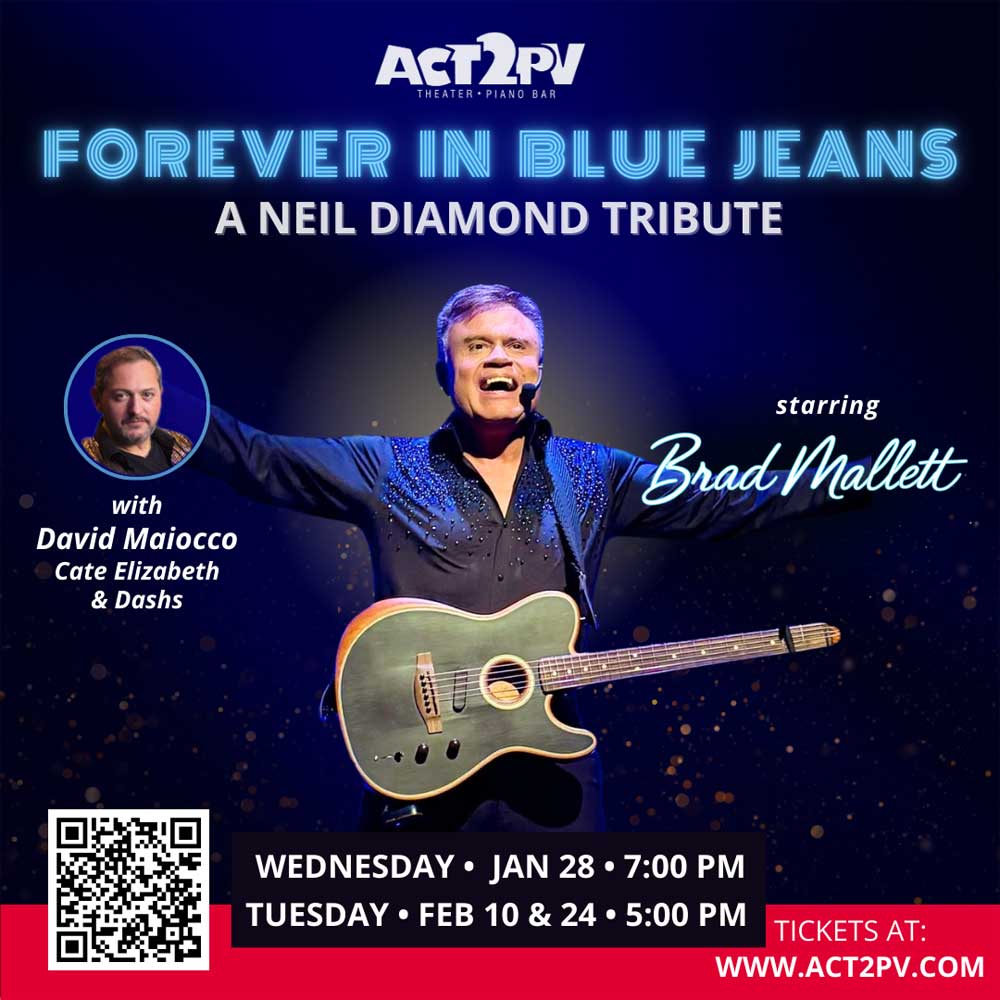 Enjoy an intimate evening celebrating the timeless music of Neil Diamond. Forever in Blue Jeans features Brad Mallett alongside a talented group of musicians, with David Maiocco on piano, Cate Elizabeth on vocals, and Dashs on guitar, bringing depth and warmth to these iconic songs.