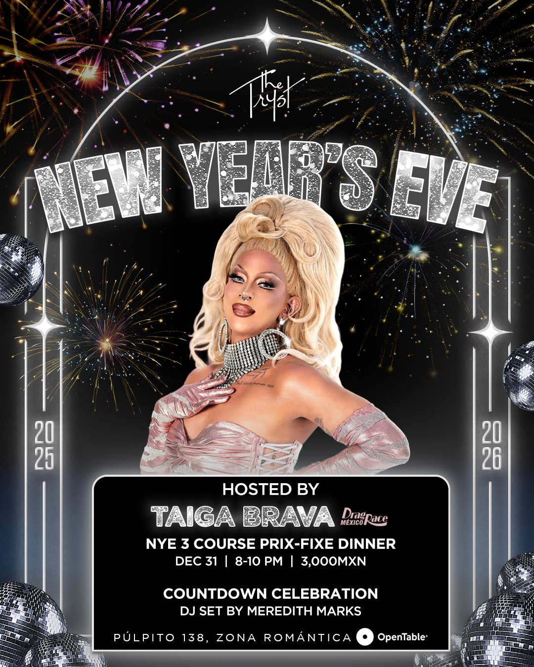 This year’s celebration takes place on Wednesday, December 31 at 8PM and features a $3,000 pesos three-course dinner with a complimentary welcome cocktail and live entertainment by the sensational Taiga Brava, winner of Queen of the Universe Season 2 and judge on Drag Race México with the DJ set of Meredith Marks at 9pm.