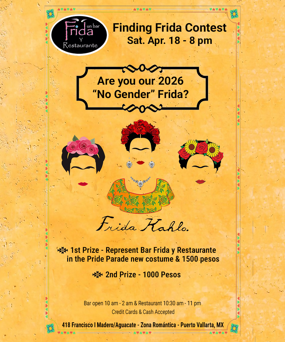 Channel your inner artist and join the fun! Our 2026 “No Gender” Finding Frida Contest kicks off on Saturday, April 18th at Bar Frida y Restaurante. To enter, simply show up at 8:00 pm dressed in your fabulous best as Frida! The winner takes home 1,500 pesos, a gorgeous new costume, and the ultimate honor of leading our float in the 2026 Vallarta Gay Pride Parade on May 21st.