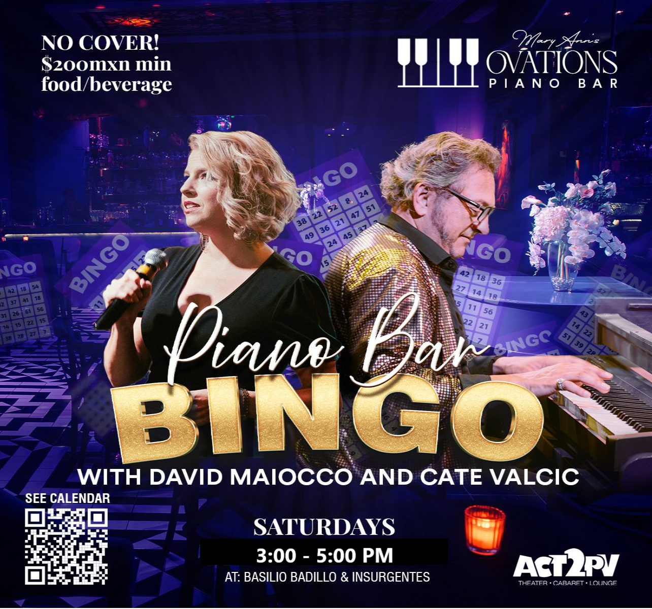 Get ready for an afternoon of outrageous fun at Piano Bar Bingo, hosted by the hilarious and talented “The Vaudevillains,” – David Maiocco and Cate Valcic! This lively event combines the excitement of bingo with the energy of a piano bar, delivering nonstop laughs, naughty surprises, and plenty of chances to win fabulous prizes. With quick wit, playful banter, and a whole lot of music, David and Cate turn every round into a party you won’t want to miss. Bring your friends, grab a drink, and get ready for a fun afternoon that’s as unpredictable as it is unforgettable!