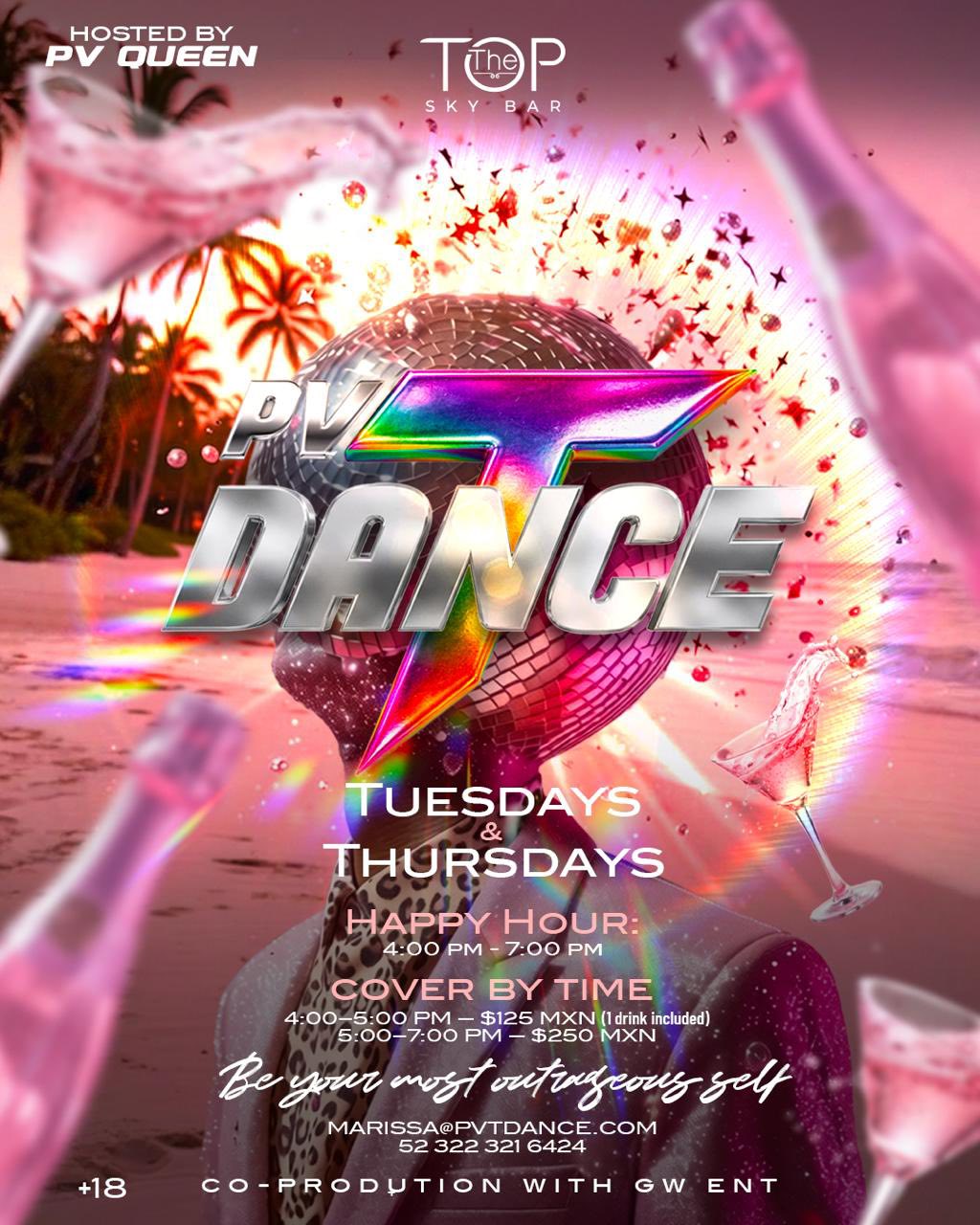 Open to everyone ages 18–80 — all genders and identities welcome. Join us for a fun-filled afternoon of dancing, laughter, and great music, all while supporting local Puerto Vallarta charities with every drink purchase and entry.