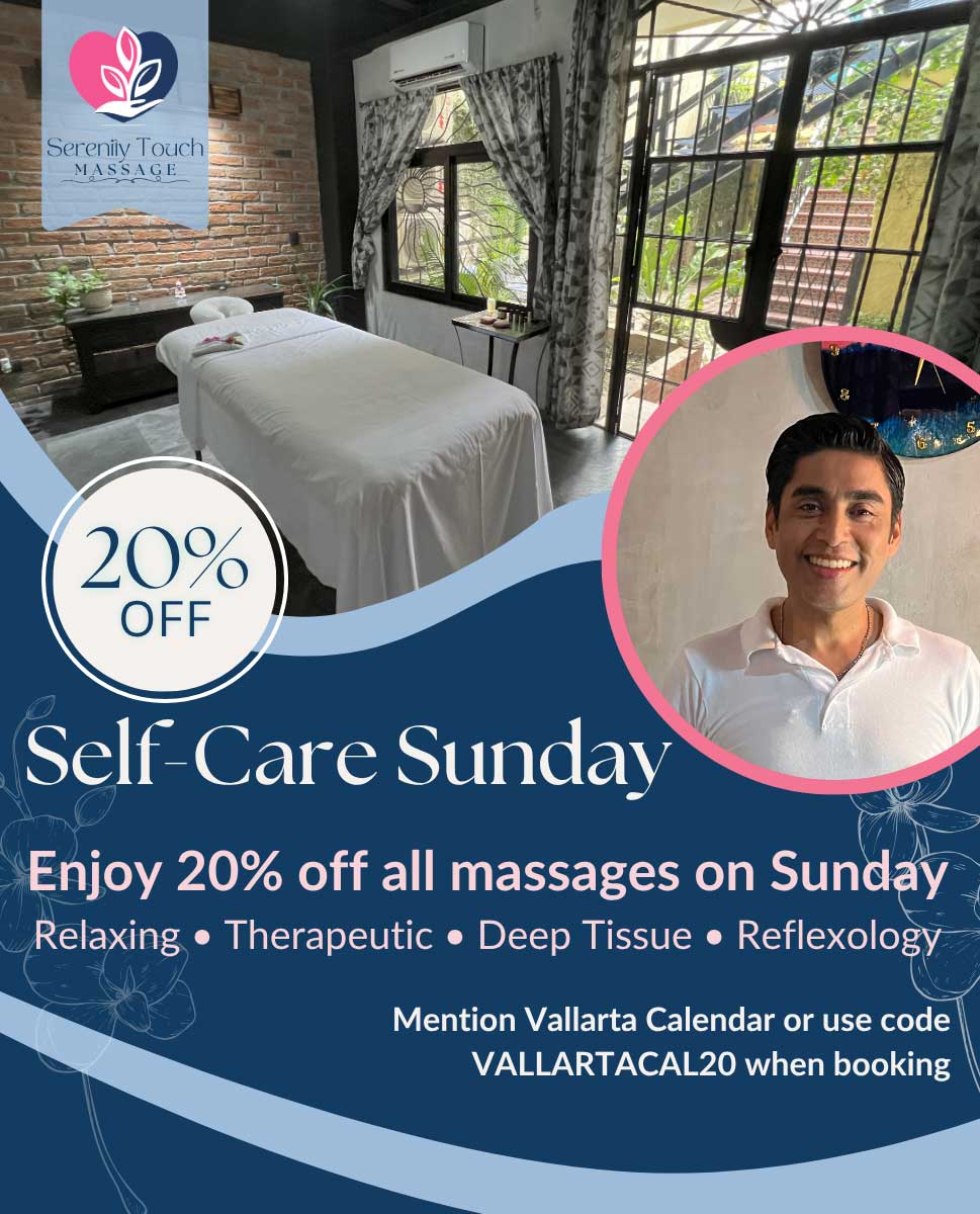 Looking for a way to wind down your weekend? Serenity Touch Massage in Zona Romántica is offering an exclusive 20% discount on massage sessions this Sunday, just for Vallarta Calendar readers.
