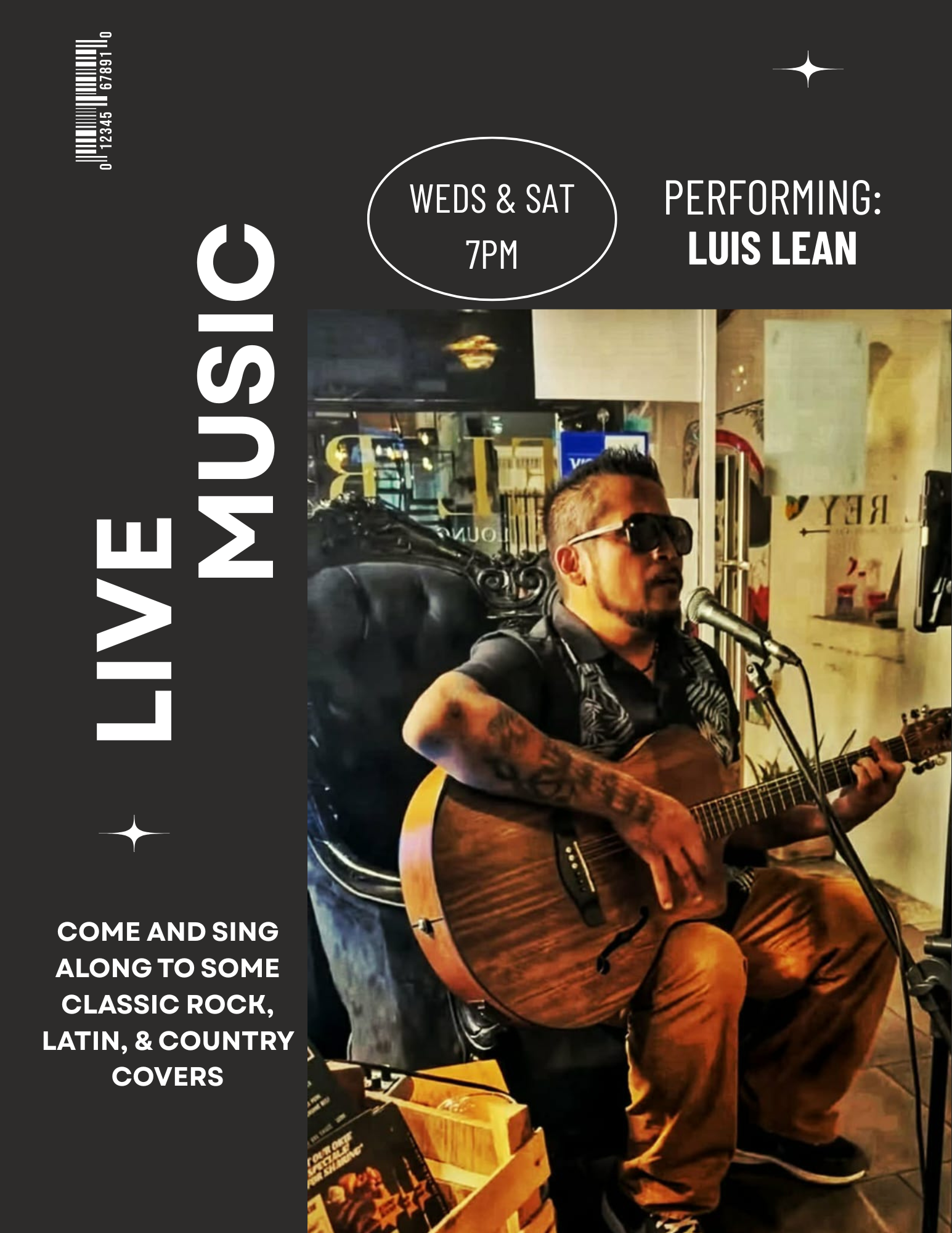 With his acoustic guitar, Luis covers hits in genres from latin to classic rock.