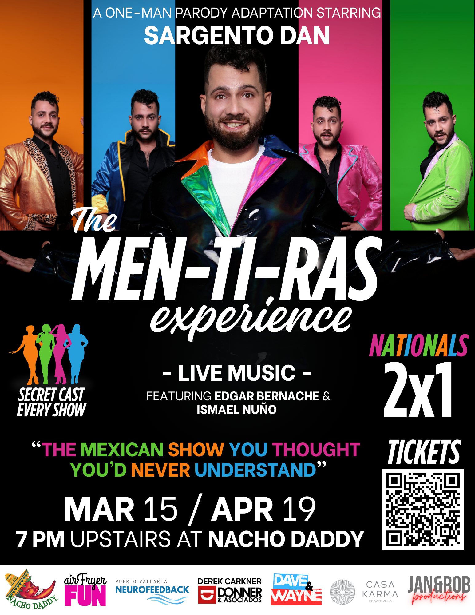 Even if your Spanish is rusty, don’t worry—this show’s infectious energy, comedy, and 80s nostalgia transcend language. With live music, outrageous moments, and heartfelt performances, MEN-TI-RAS is a night of pure joy that will have you laughing, grooving, and shouting “¡Otra, otra!” before the curtain falls.
