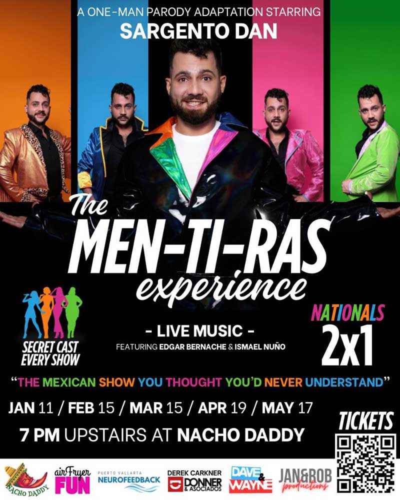 Get ready for laughter, drama, and fabulous 80s flair as Sargento Dan guides you through MEN-TI-RAS—a wildly entertaining musical packed with humor, heart, and unforgettable tunes! Four women meet at the same man’s funeral, only to discover they were all in love with him. What follows is a hilarious, emotional, and music-filled journey that proves nothing connects us quite like love, friendship, and a little chaos.