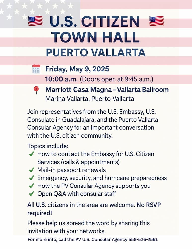 Join representatives from the U.S. Embassy, U.S. Consulate in Guadalajara, and the Puerto Vallarta Consular Agency for an important conversation with the U.S. citizen community.