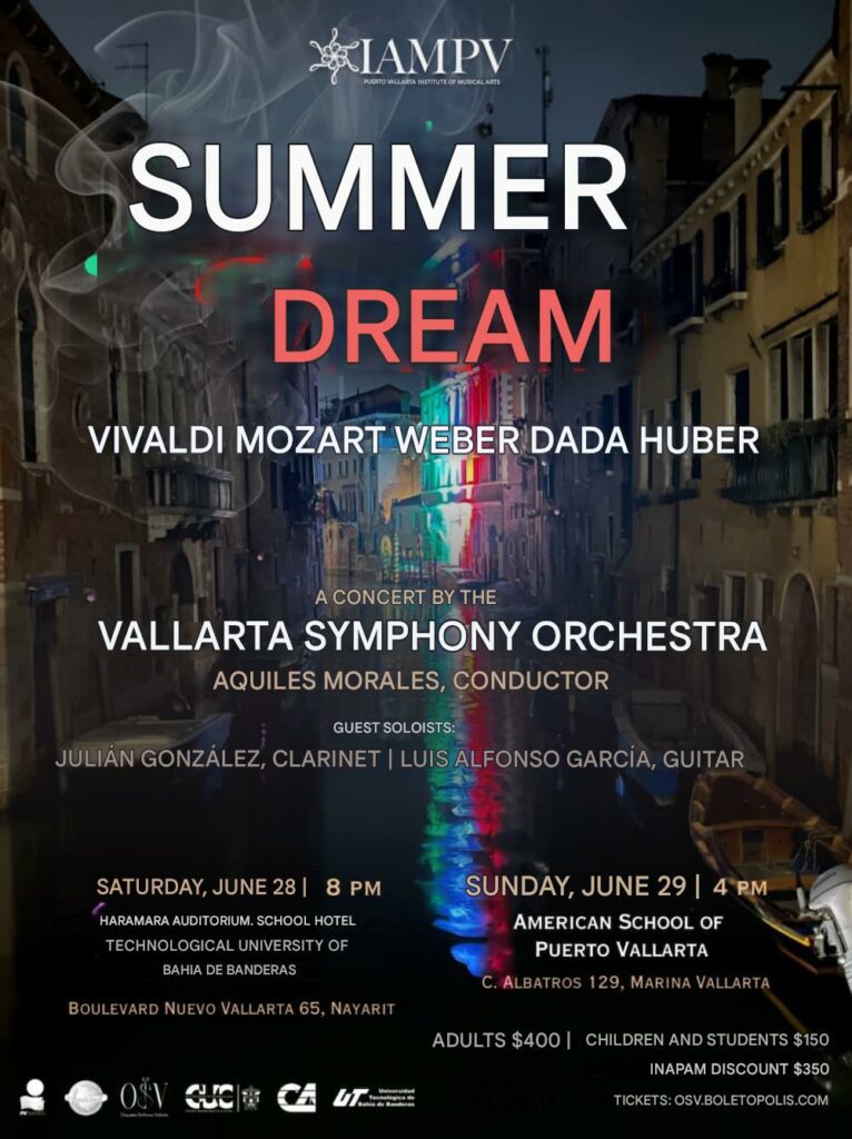 Enjoy a magical evening of classical music as the Vallarta Symphony Orchestra, under the direction of Maestro Aquiles Morales, presents Summer Dream. The program features works by Vivaldi, Mozart, Weber, Salim Dada, and Hans Huber, with standout performances by guitarist Luis Alfonso García and returning Vallarta-born clarinetist Julián González.
