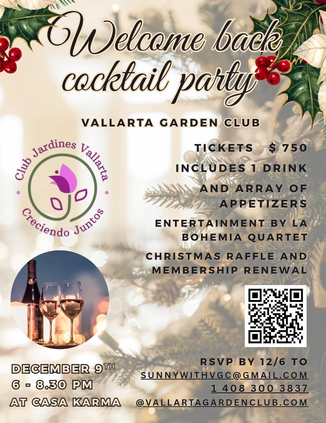The Vallarta Garden Club is welcoming its members back to Puerto Vallarta! December 9th from 6pm at Casa Karma we are hosting a cocktail party! A ticket costs 750 pesos and covers a drink and delicious hors d’oeuvres. There will be live music and great company. We hope to see you there!