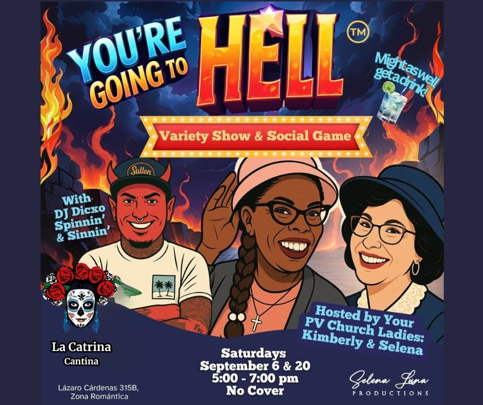The hot new variety show and social game setting La Catrina Cantina ablaze! Your PV Church-Ladies, Kimberly Grandi and Selena Luna, are bringing their holy humor and unholy sass to the stage, while behind the decks, DJ Dicxo is “spinning & sinning” with devilish beats. This isn’t just a chat show — it’s a mash-up of live variety acts, Kimberly’s powerhouse vocals, cheeky banter, and sinful surprises that will have you clutching your pearls one moment and raising your glass the next.