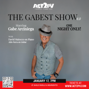 The fabulous Gabe Arciniega returns with The Gabest Show 4.0—a high-octane mix of music, comedy, stories, and show-stopping talent. Joined by David Maiocco on piano and Aldo Parra on guitar.