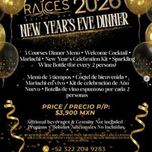 - Details: A once-in-a-lifetime culinary experience: 5-course dinner, welcome cocktail, La Linda Extra Brut, live Mariachi, and a festive New Year’s celebration kit.