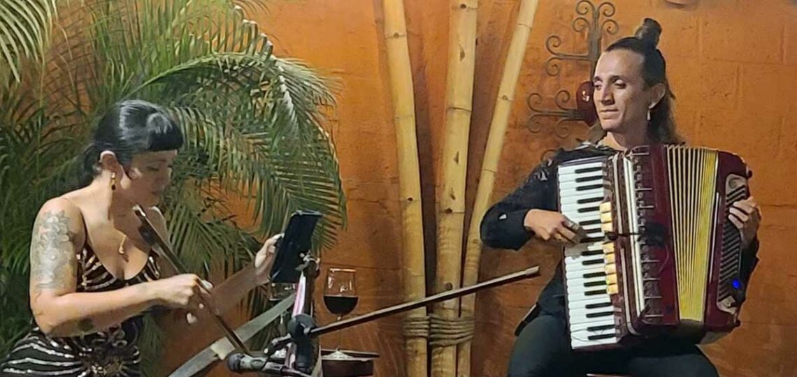 Ale(jandra) Matus was sparkling in a fabulous sequined dress that must have weighed a ton, but she carried it like a runway model. Her partner onstage and in life, Dabit Azofeifa, accompanied her on accordion and guitar while she sang in various languages and genres. This lovely couple from Costa Rica spent the intermission going to each table in the house, saying hello to friends with heartfelt hugs, and introducing themselves with panache and love to anyone they had not met before. Ale and Dabit are consummate professionals with so many fingers in as many entertainment pies. It was lovely to relax with them in the serenity of Francie Nguyen’s Casita & Garden, to sit and just listen. Thank you for that, my dear friends. Oh, and that martini…