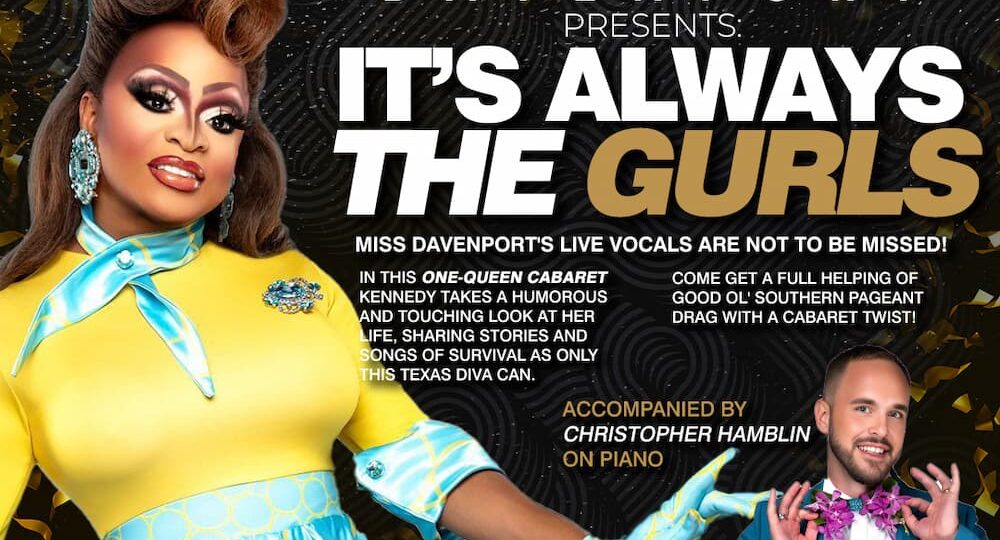Kennedy Davenport, of RuPaul’s Drag Race fame and Pageant ROYALTY, presents “It’s Always the Gurls!” In this One-Queen Cabaret, Kennedy takes a humorous and touching look at her life, sharing stories and songs of survival as only this Texas Diva can. Accompanied by Christopher Hamblin on the piano, Miss Davenport’s live vocals are not to…