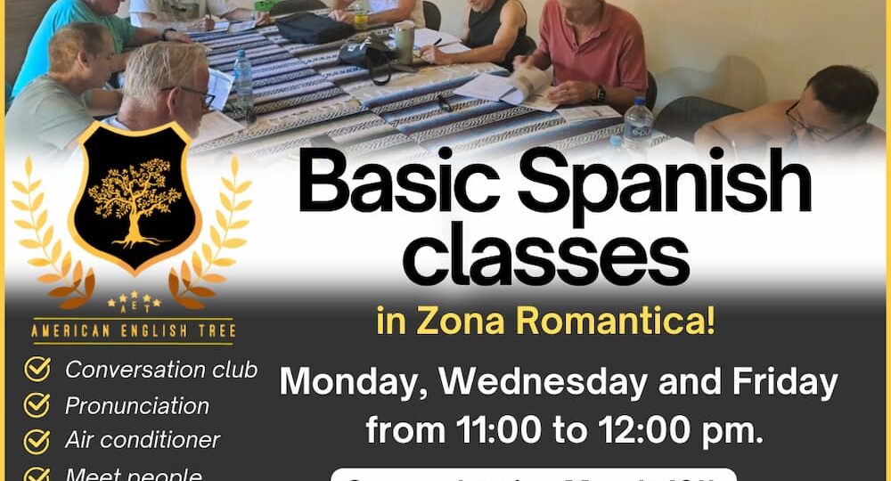 Basic Spanish classes in Zona Romantica! Monday, Wednesday and Friday from 11:00 PM to 12:00 PM. • Conversation Club• Pronunciation• Air Conditioned Classroom• Meet People• Cultural Information Visit Our WebsiteTake Our Level One Spanish Placement TestMessage Us on WhatsApp at +52 322-236-5924