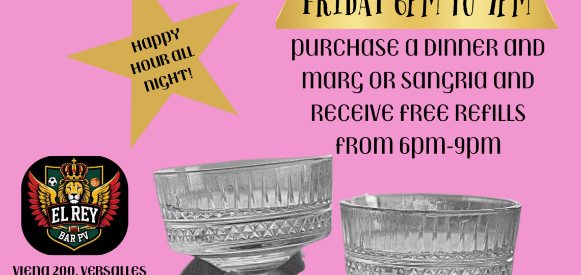 Bring your girls or your girlfriend over to El Rey Bar & Grill PV, Viena 200 in Versalles for our Ladies Night! Happy hour all night for ladies! Purchase a dinner with a margarita or sangria and receive free refills from 6pm–9pm, plus a cocktail class at 7pm! Great deals and a good time for…