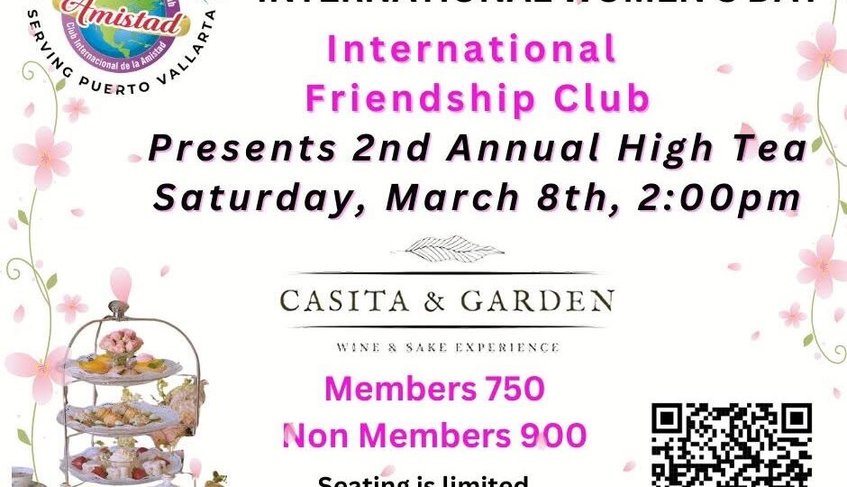Join us in celebration of International Women’s Day with special guest speakers Frankie Victoria from Vallarta Cares (Food Bank) and Lisa Manoogian from RISE while enjoying traditional High Tea as only Casita and Garden can do. Member Price – 750 pesosNon-Member Price – 900 pesos