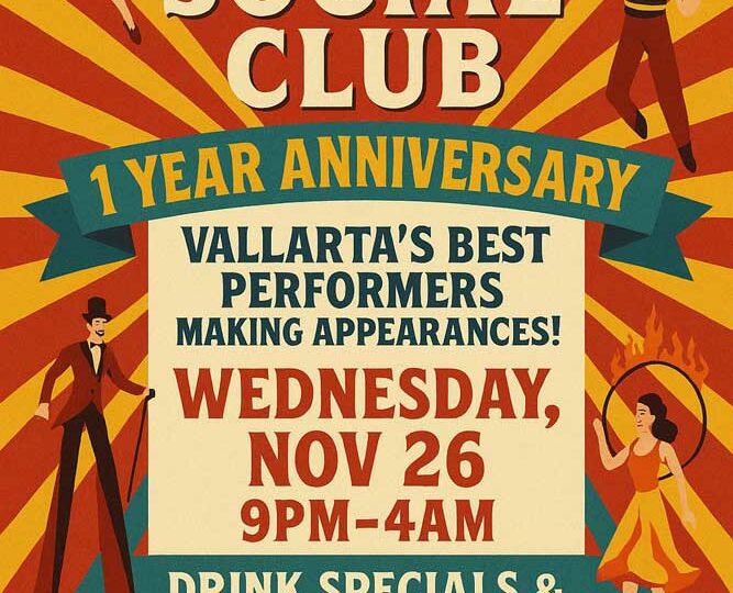 A Jonny Paradiso Joint ProductionThe Social Club1 Year AnniversaryVallarta’s Best Performers Making Appearances!Wednesday, Nov 26 · 9PM to 4AMDrink Specials & The Socialites Jazz BandBasilio Badillo 447 No Cover!